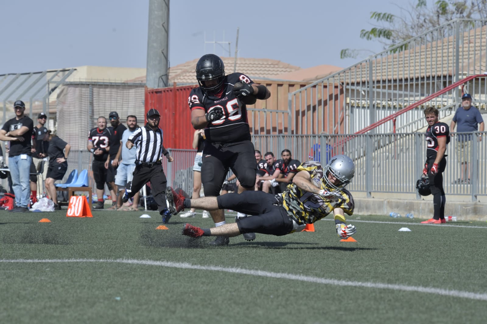 בצד השני, ההגנה של מזכרת בתיה שוב הוכיחה שהיא מהקשוחות בליגה. דורון קולטקר (7 תיקולים) ותומר צחור (7 תיקולים) סגרו את המרכז, נועם שקד (2 תיקולים, סאק אחד ו־מהלך לאיבוד של 5 יארד) סיפק לחץ בלתי פוסק על הקוורטרבק, ונב גלב (3 תיקולים ואינטרספשן ל־4 יארד) הוסיף את החותמת מהחוליה האחורית.